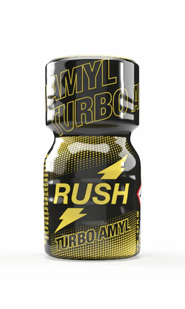 Le Poppers Rush Turbo Amyl. Présenté dans un flacon de verre incassable, ce produit est fabriqué à base de nitrite d’amyle.