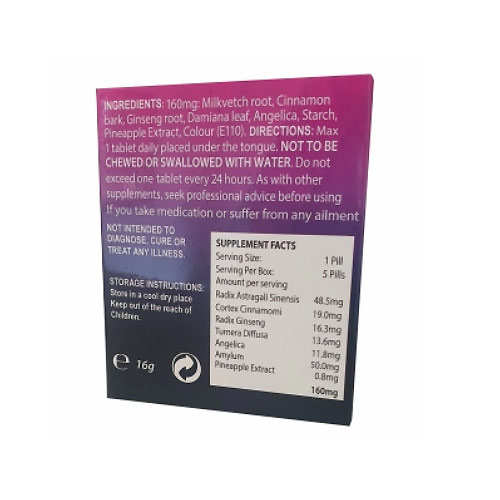 Attention: les effets peuvent varier d'une personne à l'autre, et selon les moments de prise de la capsule. Certains trouvent des effets au bout de 20 minutes, d'autres au bout de 50 minutes . ♦Limite utilisation: 06/2028 ♦ Consommable Comestible : Compléments (x 5) ♦Composition: Ingrédients actifs: Amylum (50 mg), Ginseng (16.3 mg), Tribulus Terrestri (13.6 mg), Angelica (11.8 mg), extrait d'ananas (0.8 mg). (en cours de réécriture - dosage en % ou mg sur la face B de la fiche article) ♦Emploi: Cap à placer sous la langue - ne pas ingérer directement.